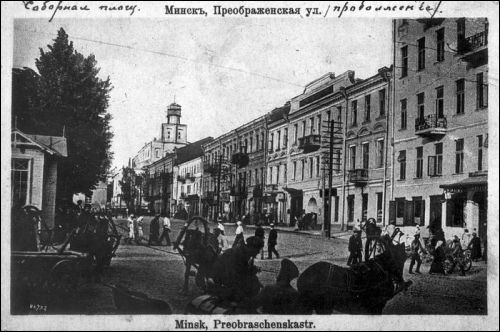 З левага боку - гасьцініца "Эўропа". За ёй бачны купалы званіцы жаночага Праабражэнскага манастыра. Пачатак ХХ ст. (У.Ліхадзедаў, "Мінск. Падарожжа ў часе", Мінск, Тэхналёгія, 2008г.)